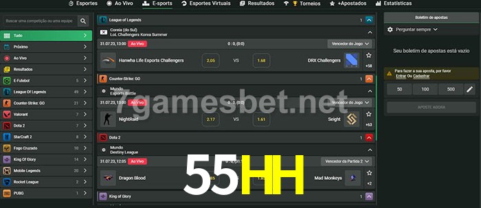 O 55HH oferece uma grande seleção de opções de apostas em e-sports com probabilidades competitivas